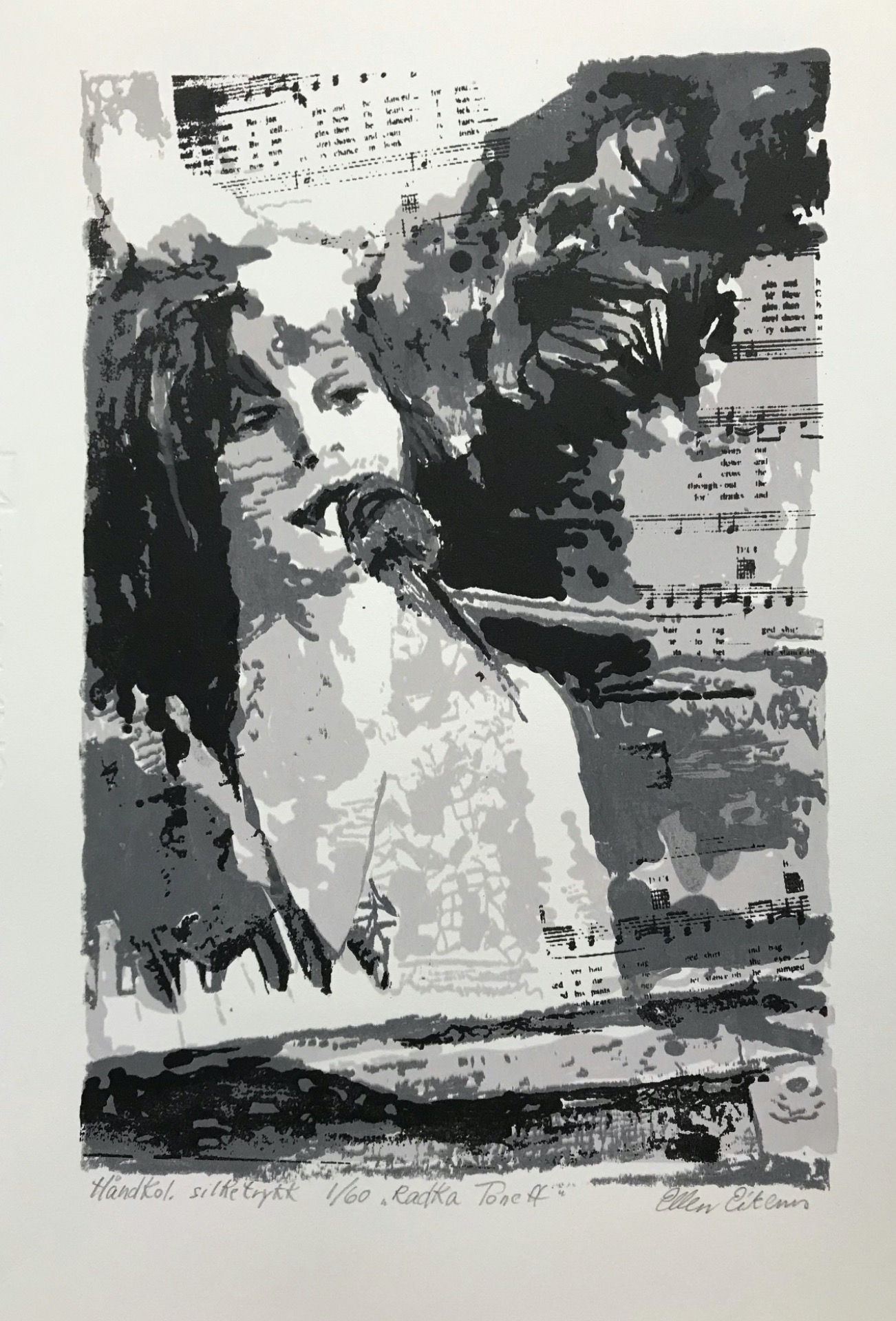 Eksempelet som jeg forteller om her er fra et silketrykk av Radka Toneff. Jeg har tidligere laget et collage/akrylmaleri av Radka Toneff og andre musikere. Videre bearbeidet jeg maleriet i Photoshop, dvs sterke forenklinger og over fra farge til sort-hvitt. Deretter maler jeg med litotusj og litoblyant på plastark det som jeg ønsker skal være lys grått. Så det samme på et annet plastark det i motivet som skal være mørk grått. Og det som skal være helt sort, maler jeg på et tredje plastark.